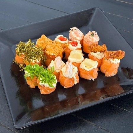 Lâminas de salmão recheadas com arroz, cream cheese e 08 opções diferentes de cobertura (cebolinha, crispy de couve, geléia de pimenta, queijo coalho com mel, camarão empanado, camarão natural, kani e pasta de salmão) totalizando 16 peças. Acompanha 60ml de teriaki e 2 sachês de shoyu Obs: Não serão permitidas trocas dos itens do combo.
