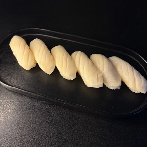 Bolinho de arroz prensado com lâminas de peixe branco. (6 Peças) - Acompanha: 30ml de teriyaki e 1 sachê de shoyu