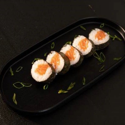 Arroz, salmão envoltos no nori (Folhas de algas marinhas). (10 Peças) - Acompanha: 30ml de teriyaki e 1 sachê de shoyu