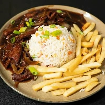 Filé em tiras com cebola ao molho shoyo, acompanha risoto (arroz, ovos, presunto e ervilha). Obs: Apenas no prato individual tem o acompanhamento de batata frita.