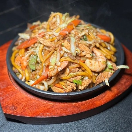 Macarrão salteado com carne, frango, camarão e legumes frescos, finalizado na chapa bem quente para entregar aquele aroma irresistível e sabor defumado que chega antes na mesa. Uma explosão de sabor!!