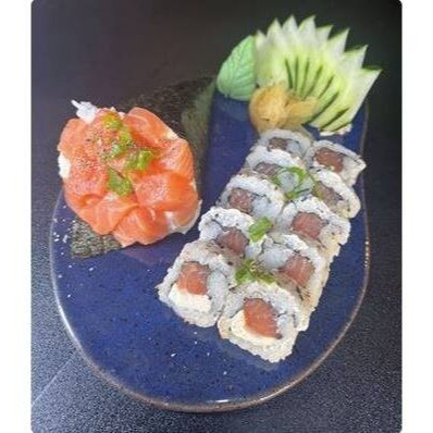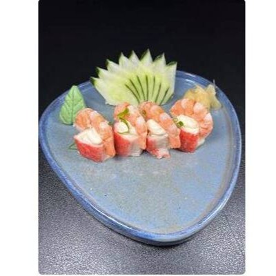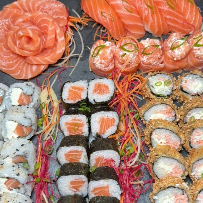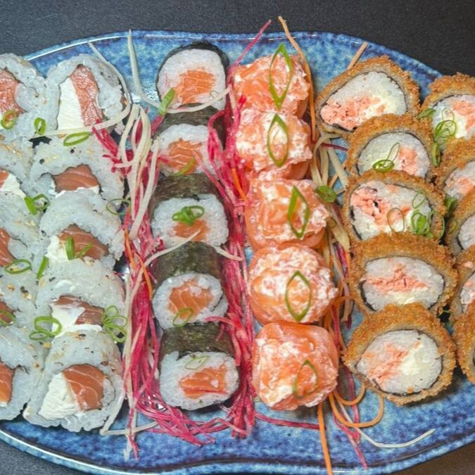 Arroz, cream cheese, camarão ou salmão em pasta, todo envolto por uma lâmina de salmão. Favor especificar o recheio: camarão ou salmão. Acompanha 2 molhos shoyu sachê 10ml e 2 molhos teriyaki 30ml