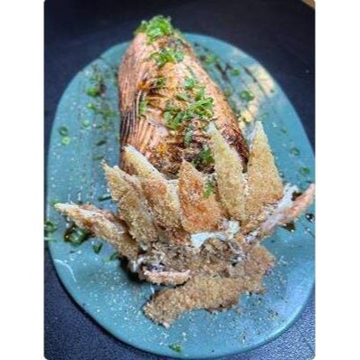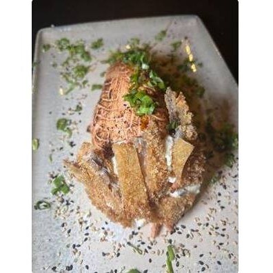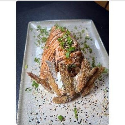 Camadas de arroz japonês recheado de camarão empanado, skin(pele de salmão) empanado e cream cheese, coberto com uma manta de salmão maçaricado. Acompanha 1 molho shoyu sachê 10ml e 1 molho teriyaki 30ml