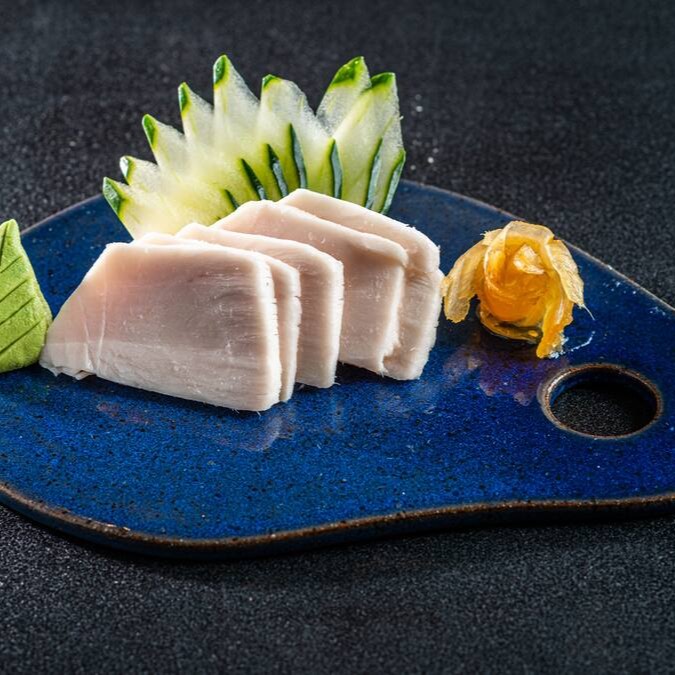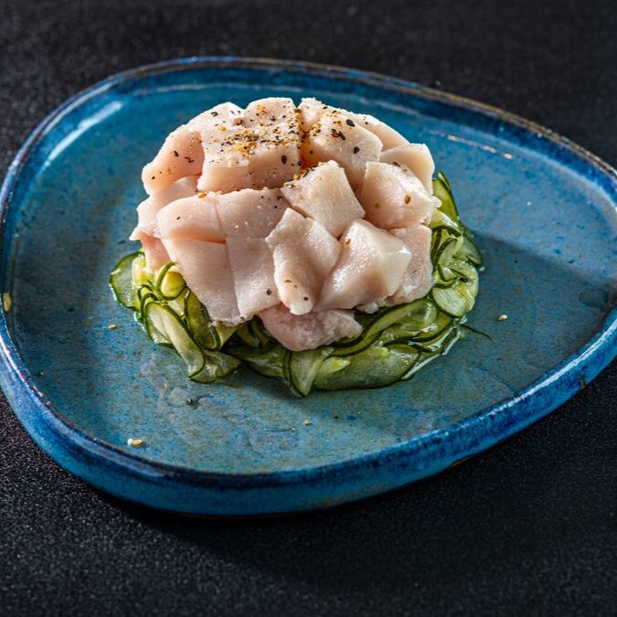 Lâminas de pepino japônes e peixe branco em cubos. (Aprox. 300g)
