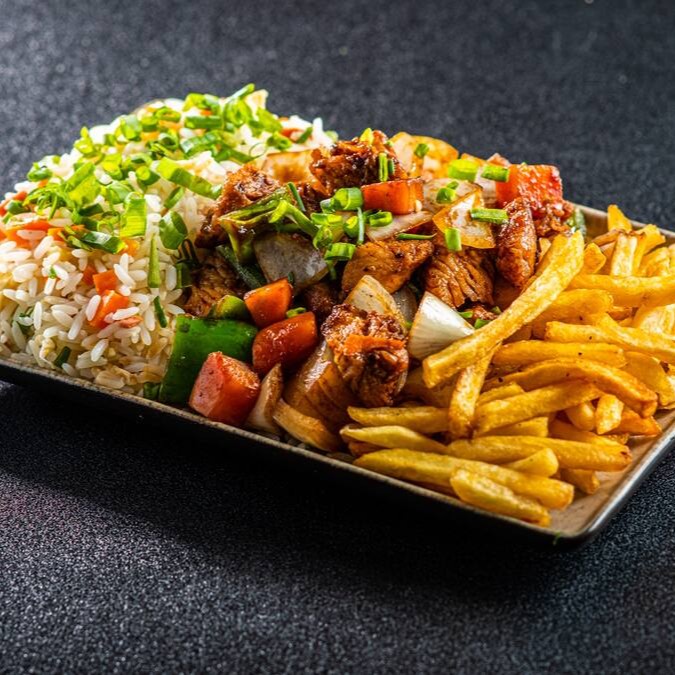 Frango em cubos, ao molho chines e legumes, acompanha arroz a grega e batata.