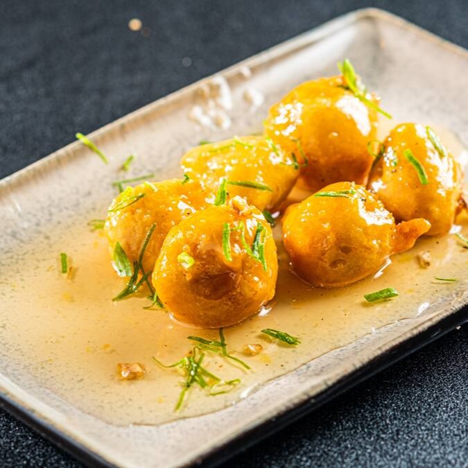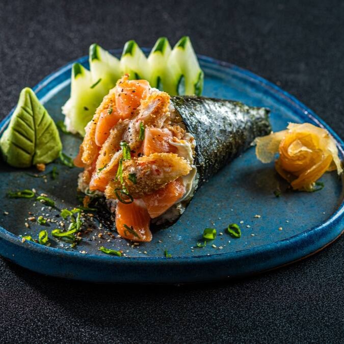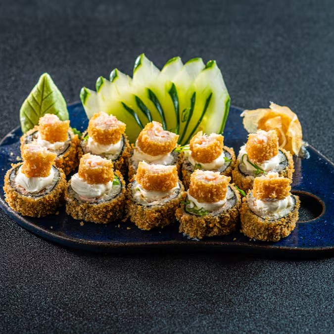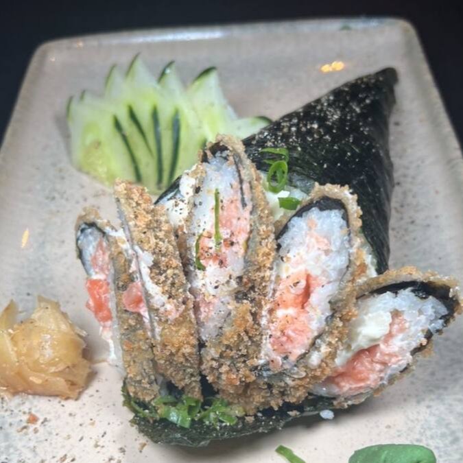Bolinho de arroz com gergelim, recheado com salmão e cream cheese, envolvido em nori, empanado e frito até ficar crocante por fora e macio por dentro.