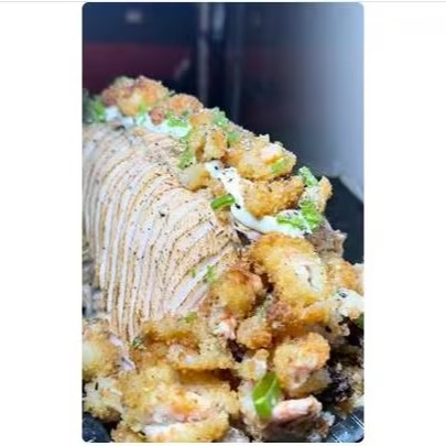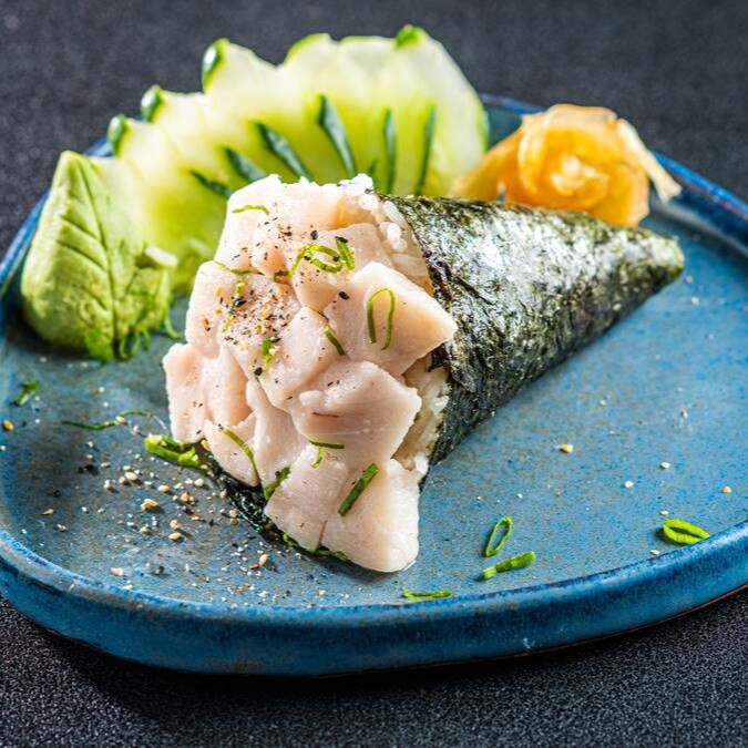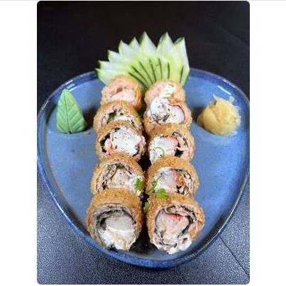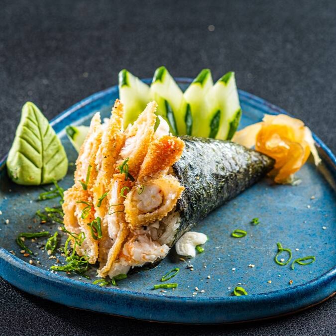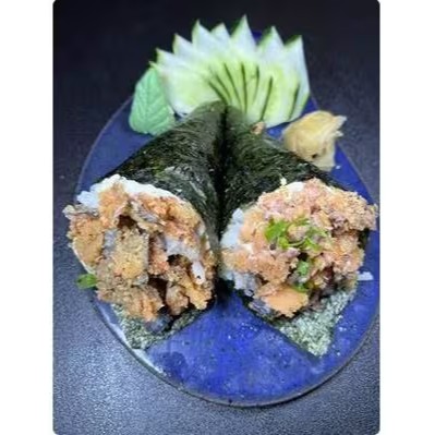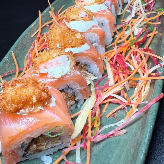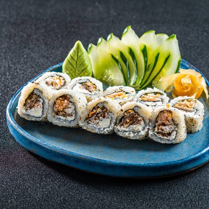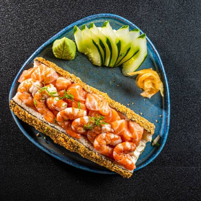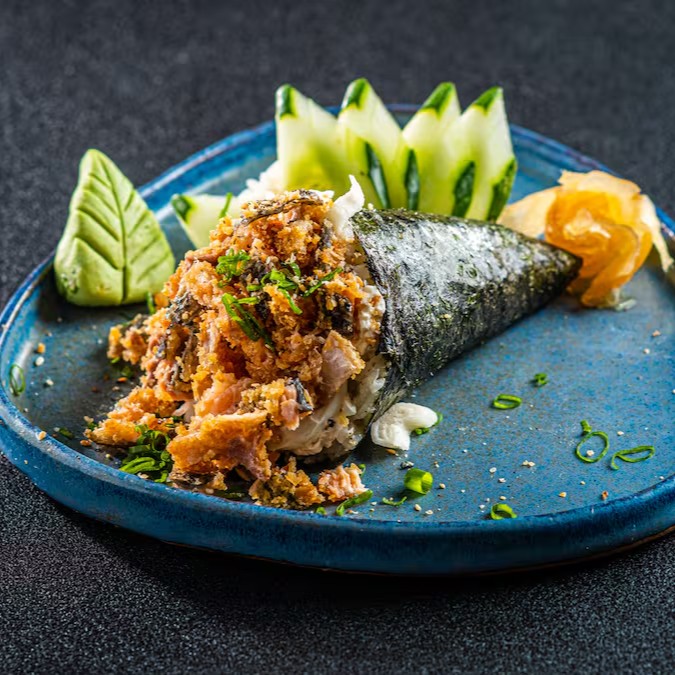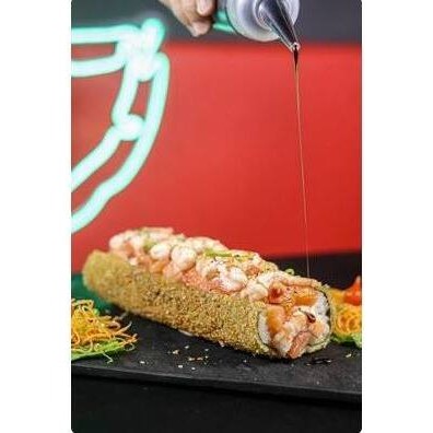 Camadas de arroz japonês recheado de camarão empanado, skin(pele de salmão) empanado e cream cheese, coberto com uma manta de salmão maçaricado. Acompanha 3 molhos shoyu sachê 10ml e 3 molhos teriyaki 30ml