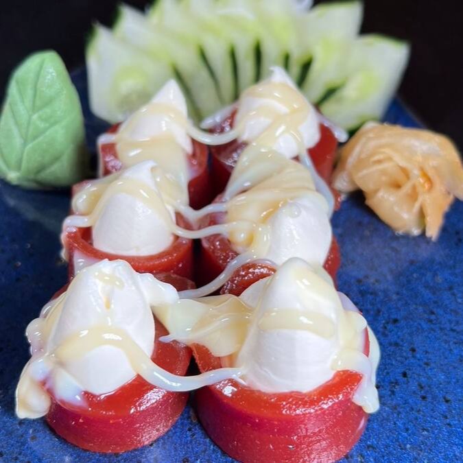 Carioca recheado com cream cheese e goiabada e finalizado com leite condensado- Acompanha: 30ml de teriyaki e 1 sachê de shoyu