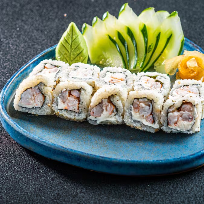 Carioca gigante, recheado com arroz, salmao em cubos , cream chese e camarão natural.