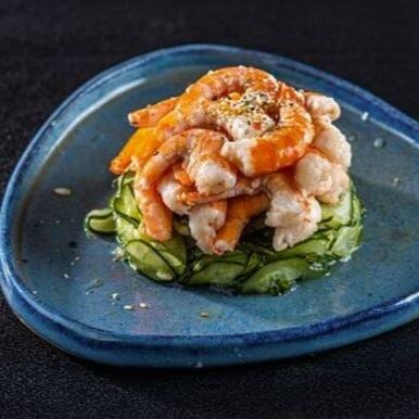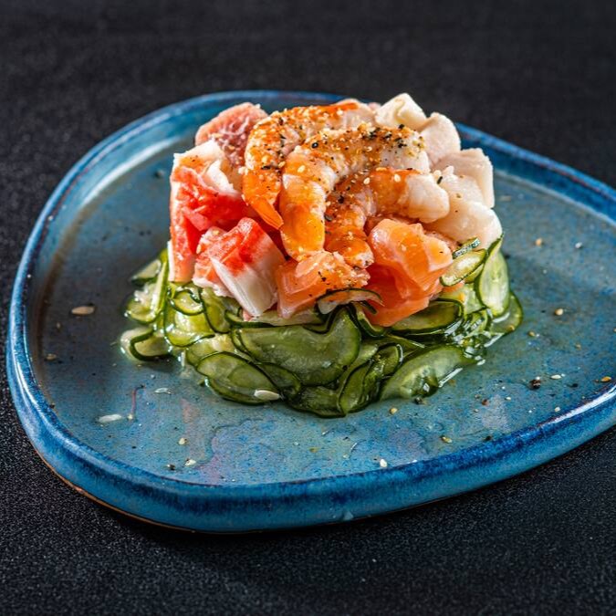 Cubos de salmao, atum, camarão e peixe branco, kani e fatias finas de cebola roxa, marinados em molho citrico especial levemente apimentado, finalizado com cebolinha e pimenta biquinho.