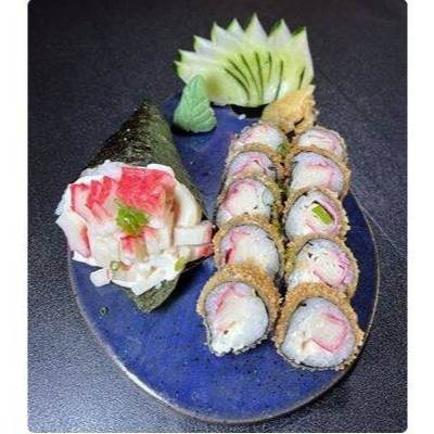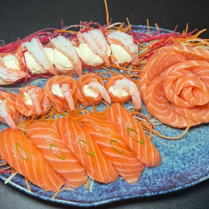 Combo composto por 5 unidades de tempura de camarão, 5 cariocas ebi, 10 uramaki de salmão crocante, 10 harumaki de salmão.