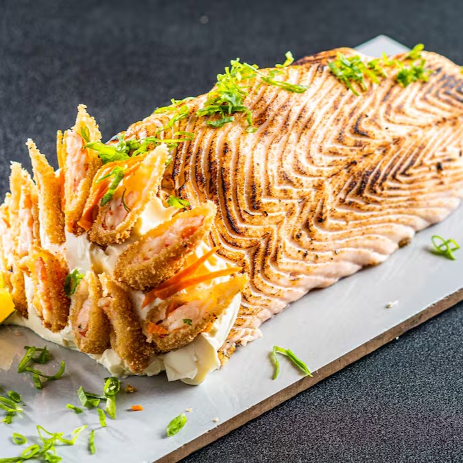 Lâmina de salmão recheada com arroz, camarão e cream cheese. (6 peças)