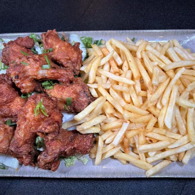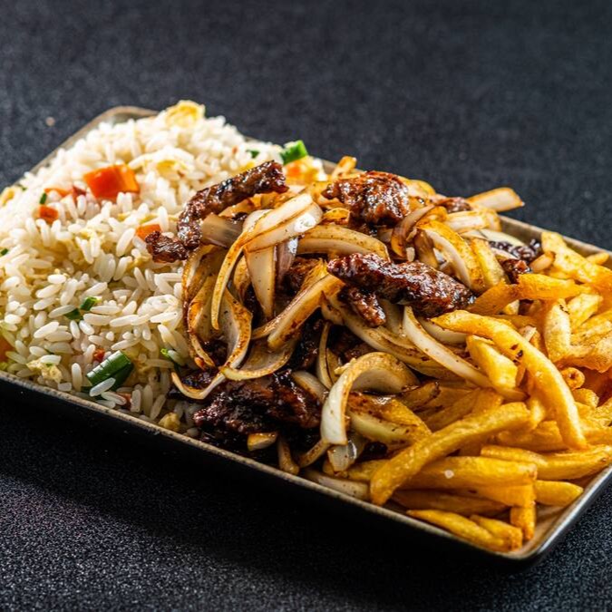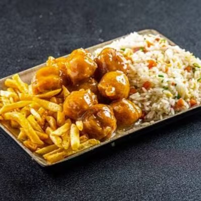 Frango no molho de laranja acompanha arroz a grega e batata.