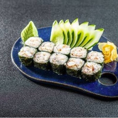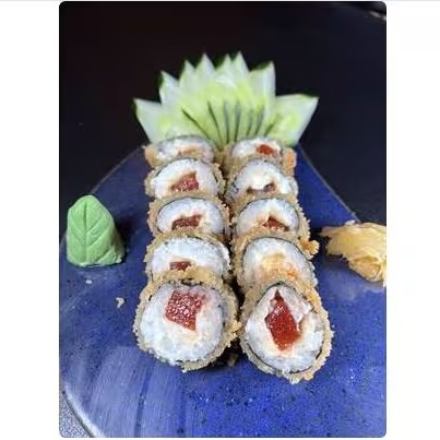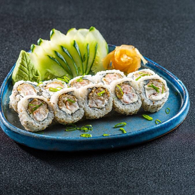 Arroz, salmão e cream cheese envolvidos no nori (folha de algas marinhas) empanado e frito com camarão extra. (10 peças)