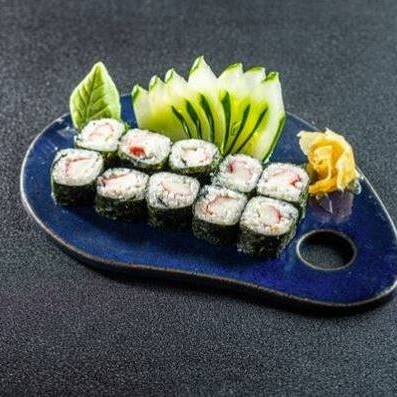 Cone de arroz recheado com pasta de kani e cream cheese envolvidos no nori (folha de algas marinhas).