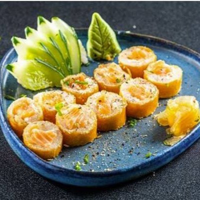 Pastinha de salmão e cream cheese com o tempero do chef, enrrolada e frita na massa harumaki.