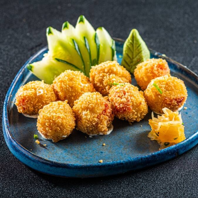 Bolinha De Arroz Com Gergelim, Recheado Com Salmão E Cream Cheese, Envolvido No Nori (Folhas De Algas Marinhas) Empanado E Frito- 10 Peças - Acompanha: 30ml de teriyaki, 1 sachê de shoyu e 1 hashi
