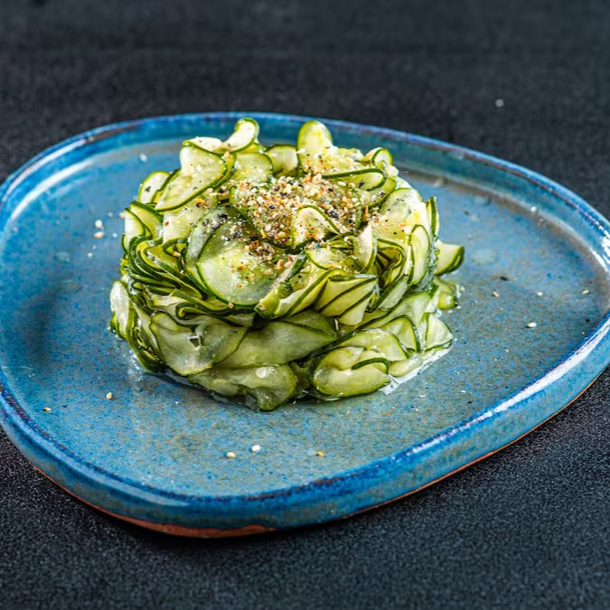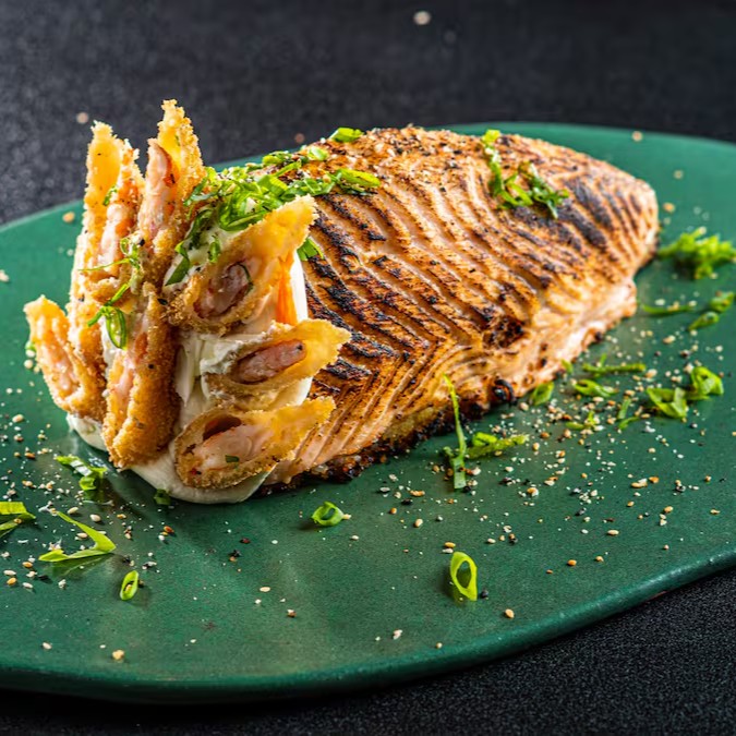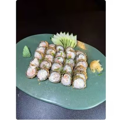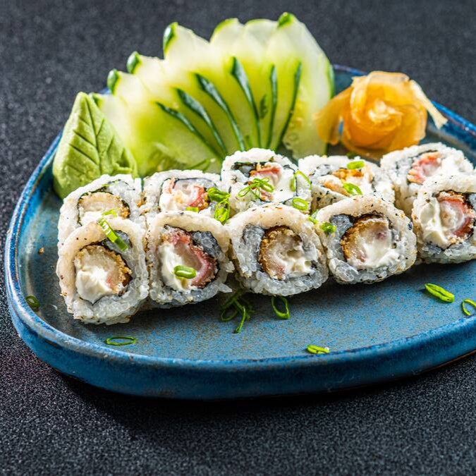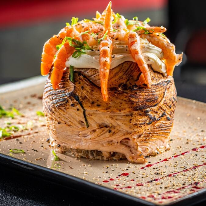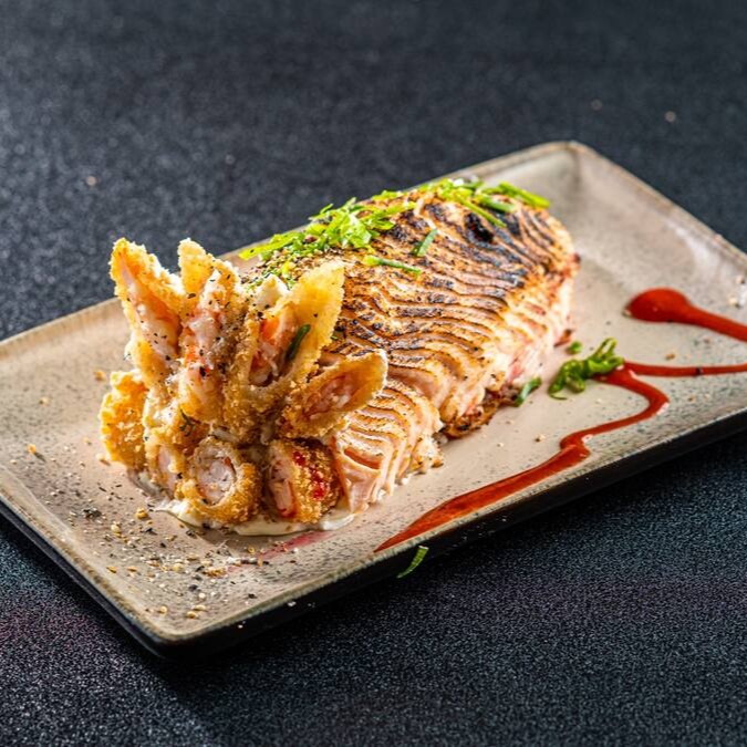 Camadas de arroz japonês recheado de camarão empanado, skin(pele de salmão) empanado e cream cheese, coberto com uma manta de salmão maçaricado. Acompanha 3 molhos shoyu sachê 10ml e 3 molhos teriyaki 30ml