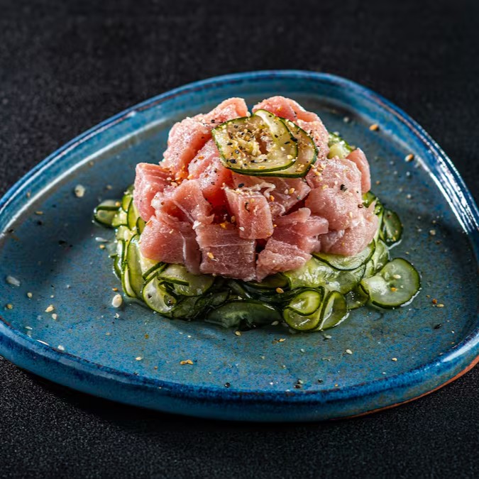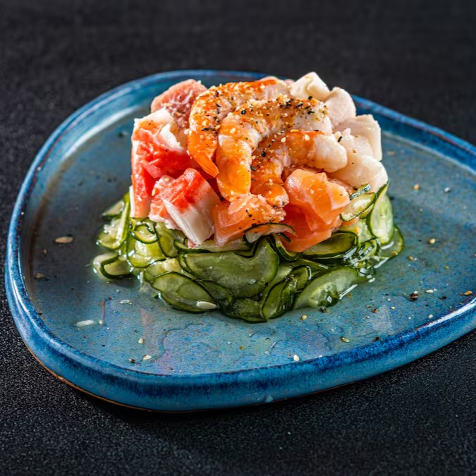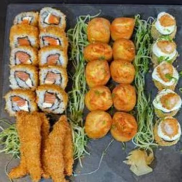Combo composto por 5 unidades de tempura de camarão, 5 cariocas ebi, 10 uramaki de salmão crocante, 10 harumaki de salmão.