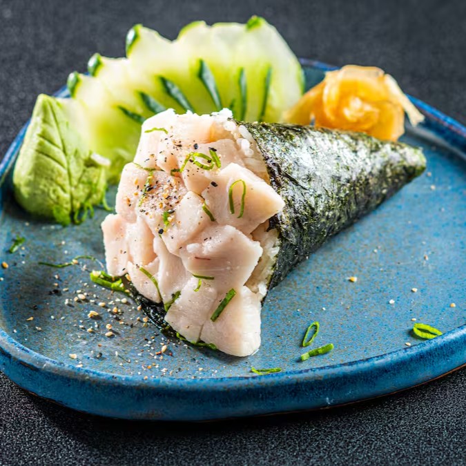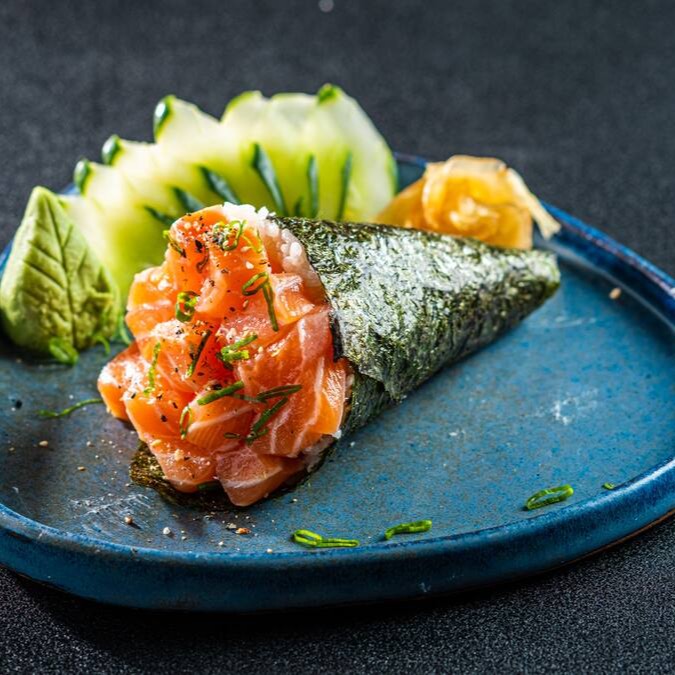 Cone de arroz recheado com salmão, camarão (empanado e frito) e cream cheese envolvidos no nori (folha de algas marinhas).
