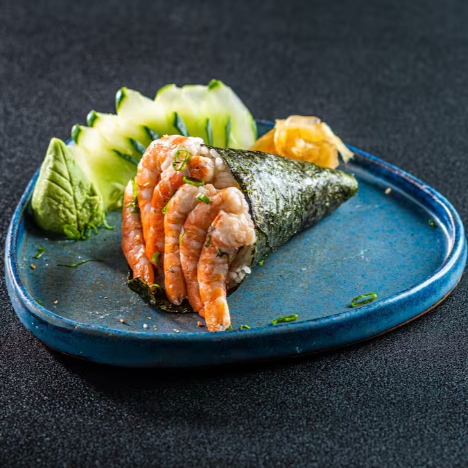 Cone de arroz recheado com camarão (empanado e frito) e cream cheese envolvidos no nori (folha de algas marinhas).