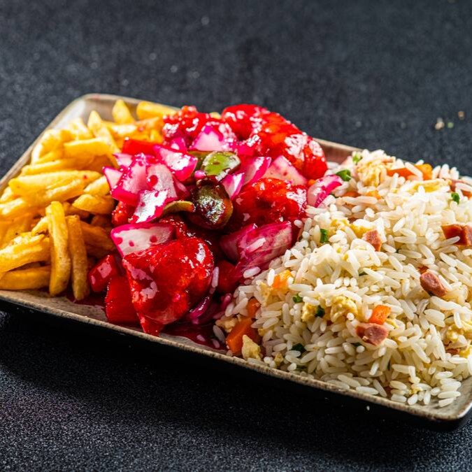 Frango no molho agridoce acompanha arroz a grega e batata.