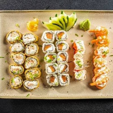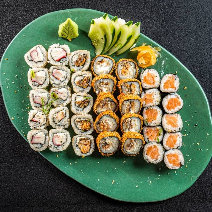 10 Cariocas De Salmão, 10 Uramakis De Salmao, 2 Dragon , 2 Ebi Joy, 2 Joy Joy, 4 Kani Queijo - Acompanha: 60ml de teriyaki e 3 sachê de shoyu