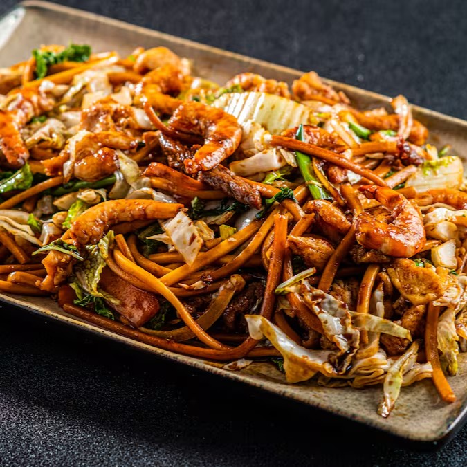 Macarrão bifum, carne, frango e legumes cozidos ao nosso delicioso molho shoyu/curry. Favor especificar qual o molho desejado: shoyu ou curry.