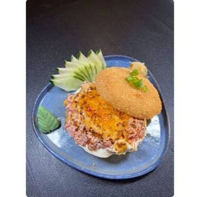 Camadas de arroz japonês recheado de camarão empanado, skin(pele de salmão) empanado e cream cheese, coberto com uma manta de salmão maçaricado. Acompanha 1 molho shoyu sachê 10ml e 1 molho teriyaki 30ml