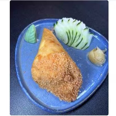 Cone de arroz recheado com kani (empanado e frito) e cream cheese envolvidos no nori (folha de algas marinhas).