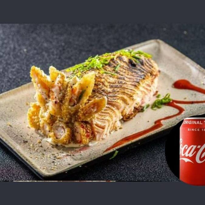 Camadas de arroz japonês recheado de camarão empanado, skin(pele de salmão) empanado e cream cheese, coberto com uma manta de salmão maçaricado. Acompanha 2 molhos shoyu sachê 10ml e 2 molhos teriyaki 30ml e um unidade de Coca Lata 350ml
