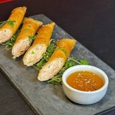 Temaki frito na massa de harumaki, arroz japones, pasta de salmao, cream cheese e finalizado com cebolinho.