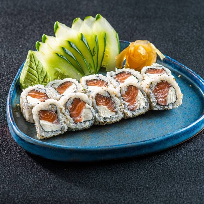Arroz, cream cheese, camarão ou salmão em pasta, todo envolto por uma lâmina de salmão. Favor especificar o recheio: camarão ou salmão. Acompanha 2 molhos shoyu sachê 10ml e 2 molhos teriyaki 30ml