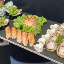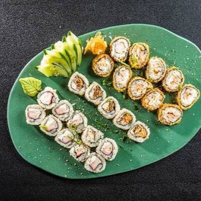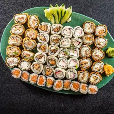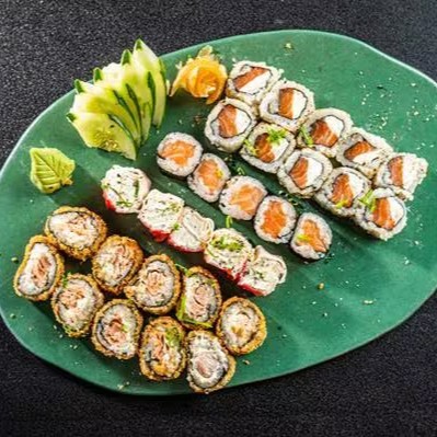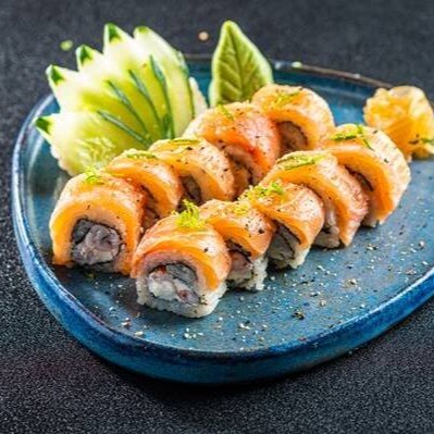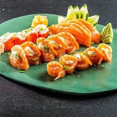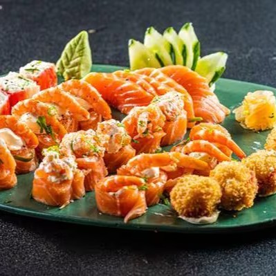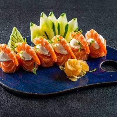 Arroz japonês, com recheio de camarão empanado, coberto com cream cheese e camarão pré cozido, envolto em lâmina de salmão natural ou maçaricada (aprox. 1,2kg). Acompanha 3 molhos shoyu sachê 10ml e 3 molhos teriyaki 30ml