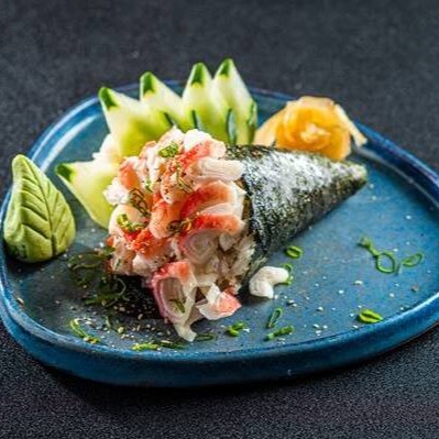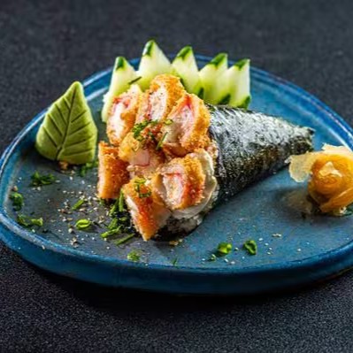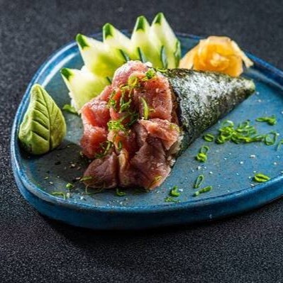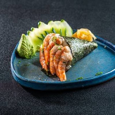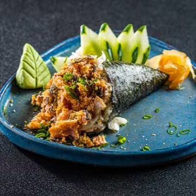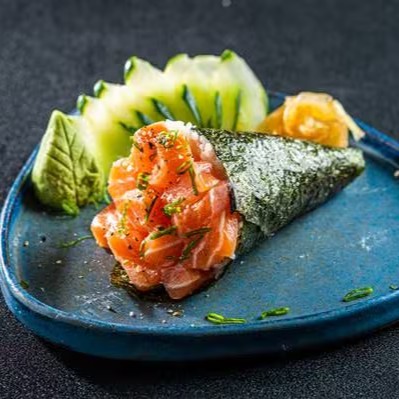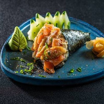 O Maior Temaki de alga da casa! Cone de arroz recheado com pasta de salmão, carioca e cream cheese envolvidos no nori (folha de algas marinhas).