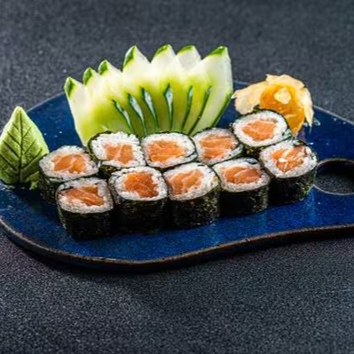 Arroz e salmão envolvidos no nori (folha de algas marinhas). (10 peças)