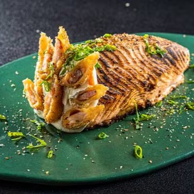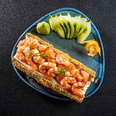 Camadas de arroz japonês recheado de camarão empanado, skin(pele de salmão) empanado e cream cheese, coberto com uma manta de salmão maçaricado. Acompanha 2 molho shoyu sachê 10ml e 1 molho teriyaki 30ml