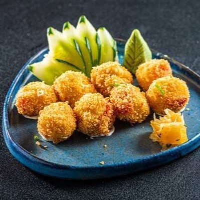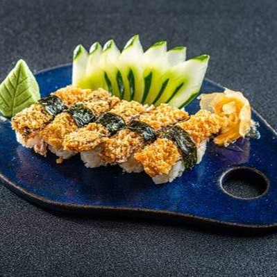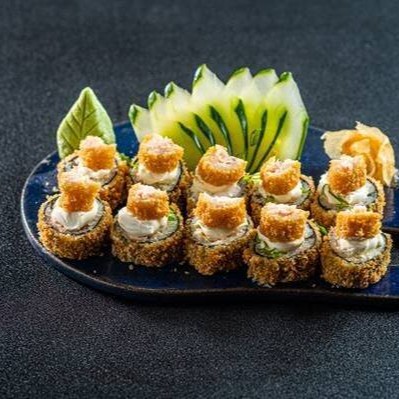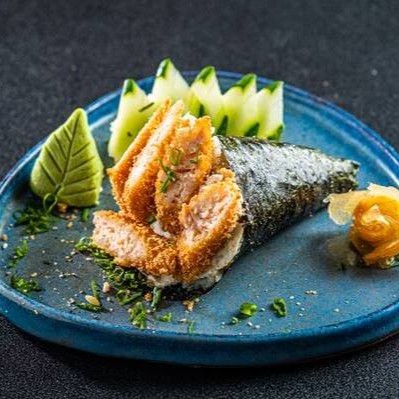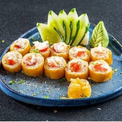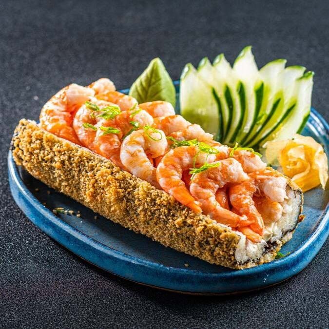 Arroz, salmão, camarão e cream cheese envolvidos no Nori (folha de algas marinhas) empanado e frito. Acompanha: 30ml de teriyaki e 1 sachê de shoyu (10ml)