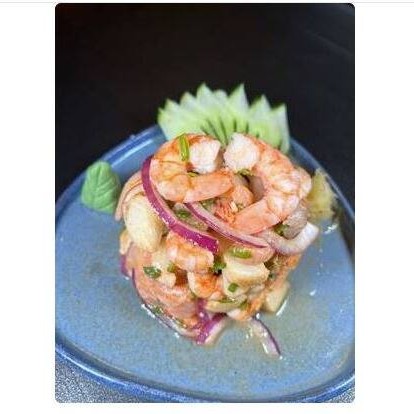 Cubos de salmao, atum, camarão e peixe branco, kani e fatias finas de cebola roxa, marinados em molho citrico especial levemente apimentado, finalizado com cebolinha.
