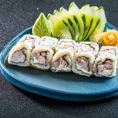 Arroz, salmão e cream cheese envolvidos no nori (folha de algas marinhas) empanado e frito com camarão extra. (10 peças)