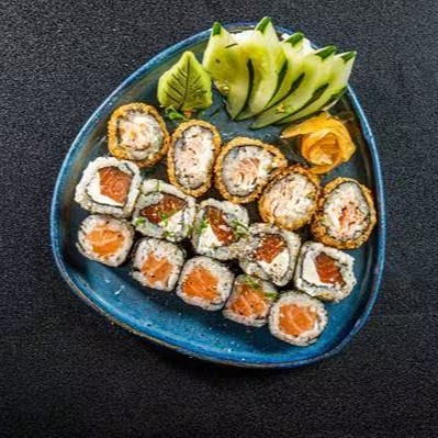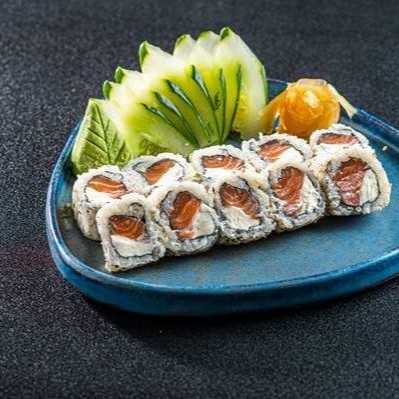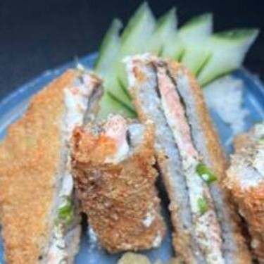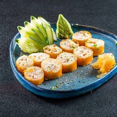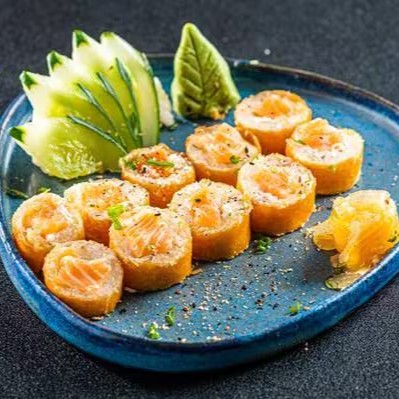 Arroz, salmão e cream cheese envolvidos no nori (folha de algas marinhas) empanado e frito. (10 peças)