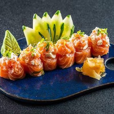 Lãmina de salmão recheada com arroz, pasta de salmão e cream cheese. (6 peças)