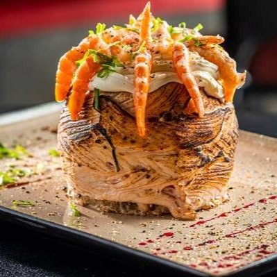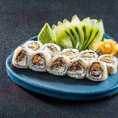 Camadas de arroz japonês recheado de camarão empanado, skin(pele de salmão) empanado e cream cheese, coberto com uma manta de salmão maçaricado. Acompanha 3 molhos shoyu sachê 10ml e 2 molhos teriyaki 30ml