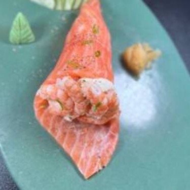 Lâmina de salmão recheada com arroz, camarão e cream cheese. (6 peças)