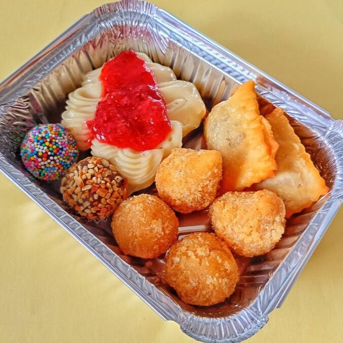 Uma combinação feita pra te conquistar Brownie recheado, doces deliciosos e salgadinhos crocantes — tudo em uma marmitinha supercompleta! Acompanha 1 Brownie Recheado, 2 doces (Brigadeiro e Bem Casado) 6 salgados fritos (Coxinha, Pastel de Carne e Bolinha de Queijo).
