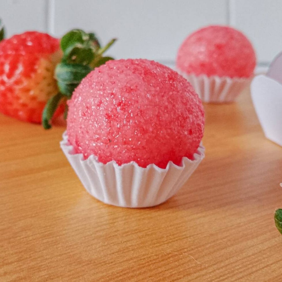 Brigadeiro sabor morango enrolado em açúcar cor de rosa. Unid. 15g