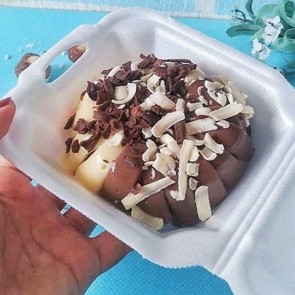 200g – Porção individual — Mini Vulcão individual com massa de chocolate fofinha, cobertura de brigadeiro branco e preto, decorado com raspas. Aprx.200g Bolo na marmita