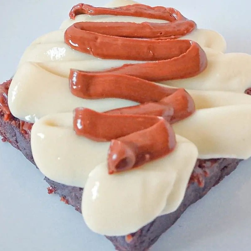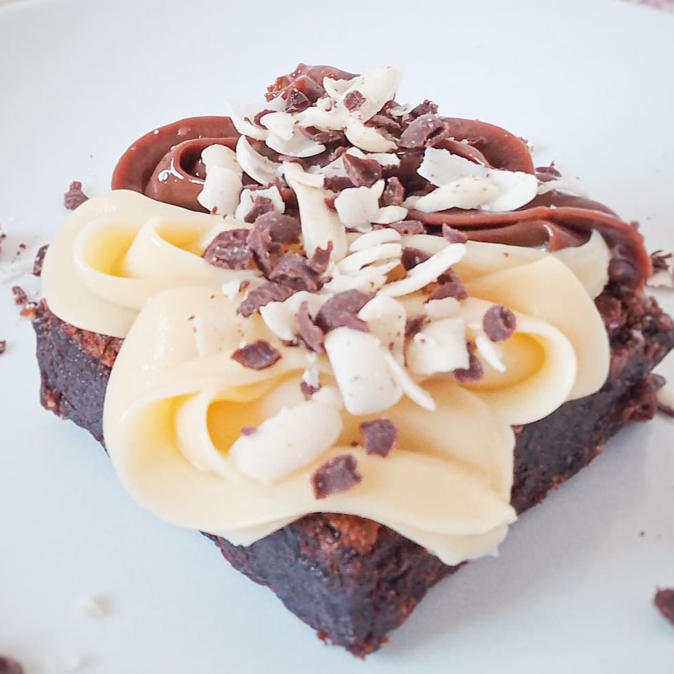 Brownie super macio, molhadinho por dentro, sequinho por fora com cobertura de brigadeiro tradicional e brigadeiro branco. Decorado com raspas de chocolates. Aprx 100g