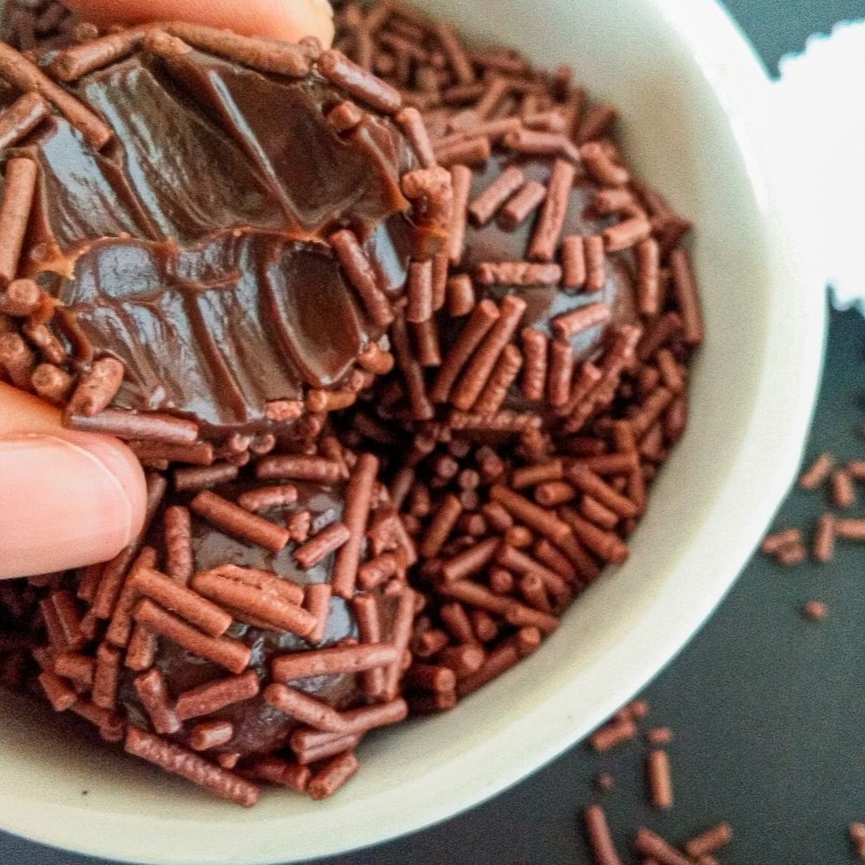 O tradicional Brigadeiro super macio e gostoso, utilizamos chocolate 50% cacau, envolto em confeitos sabor chocolate. 15g