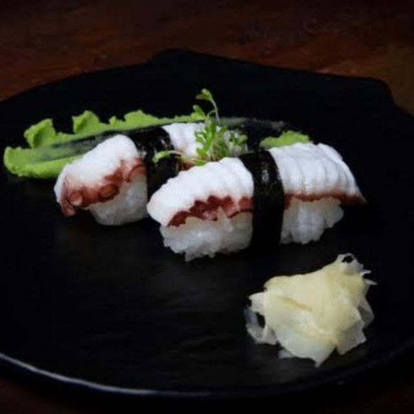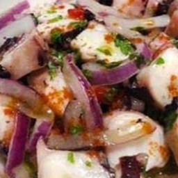 Polvo marinado em limão e azeite, com cebola rocxa, pimenta biquinho, dedo de moça, tagarashi e cebolinha.